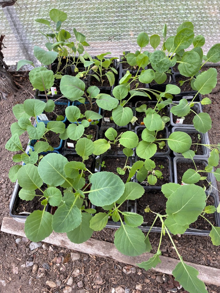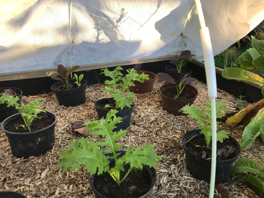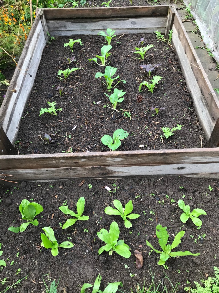 Pak choi og salatsennep (Wasabini), der blev sået sidst i august, er nu omplantet i potter, der er sat på tomme pladser i drivhuset og i salatbaren. Sammen med radicchio og grønkål vil det være det primære, grønne bidrag til vintersalaten.