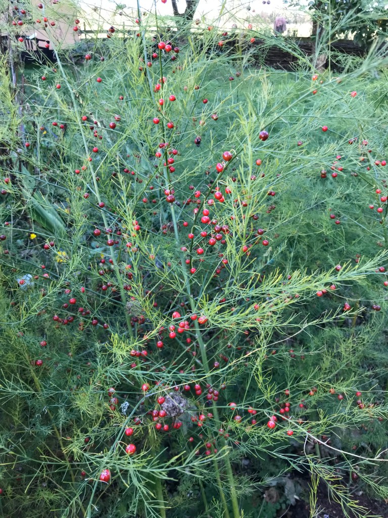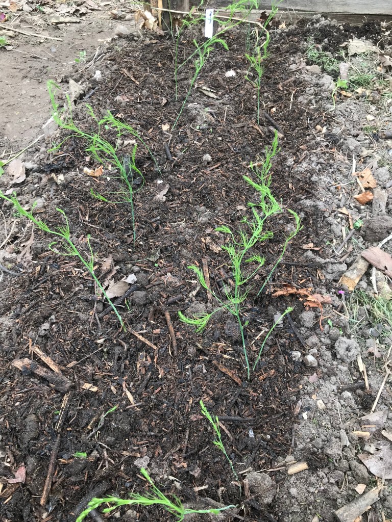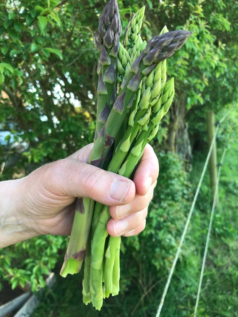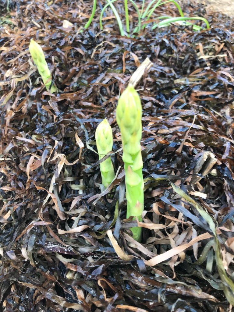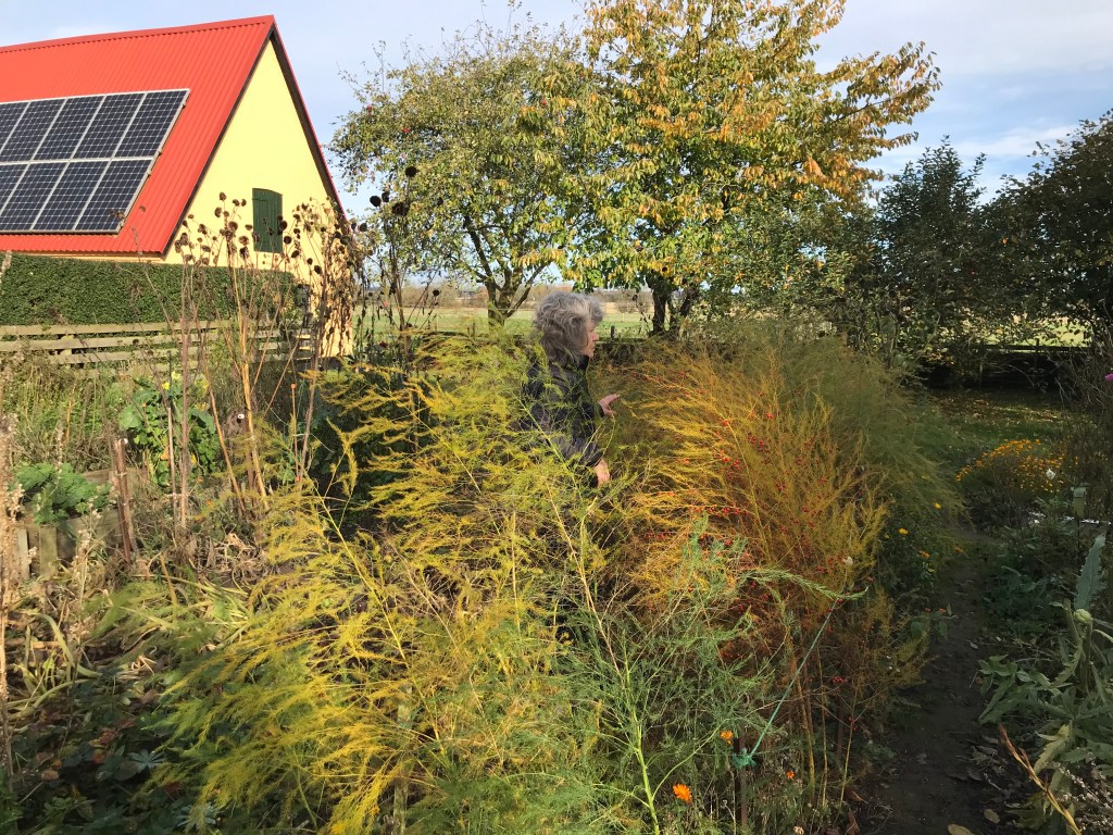 Løvet er ved at få efterårsfarver – et tegn på at næringsstofferne er trukket tilbage til rødderne – så det er nu, de skal klippes ned og toppen fjernes. De får samtidig en gang hønsegødning og et drys kalk under vinterdækket, så gødningsniveauet er optimalt, når planterne igen skal til at producere asparges i starten af maj.