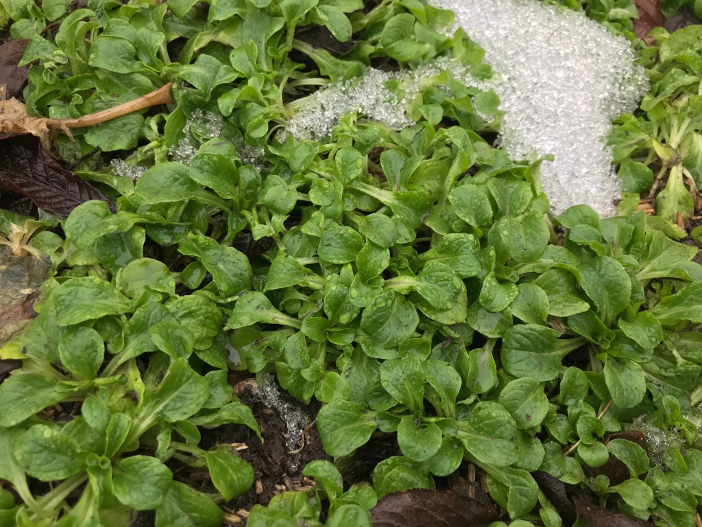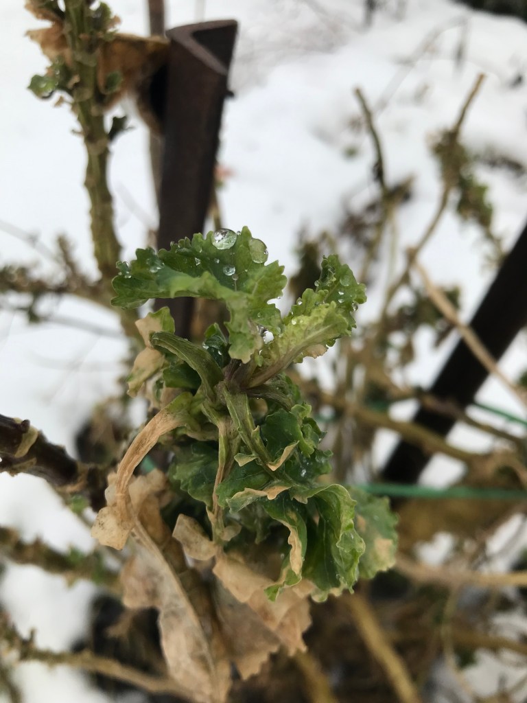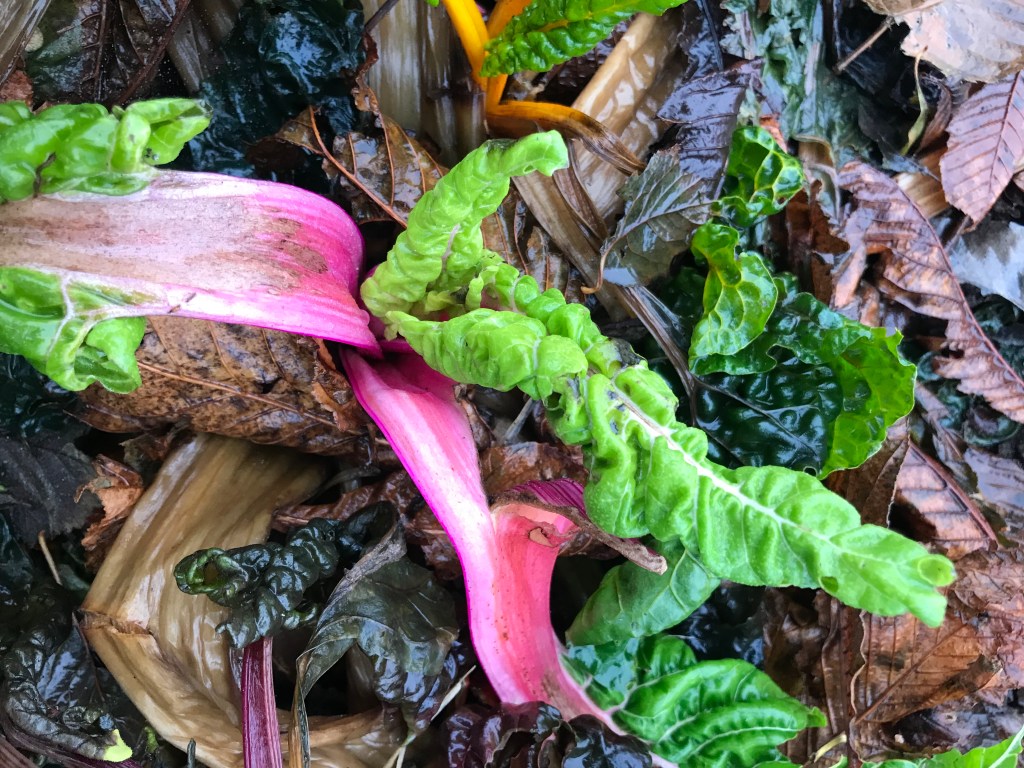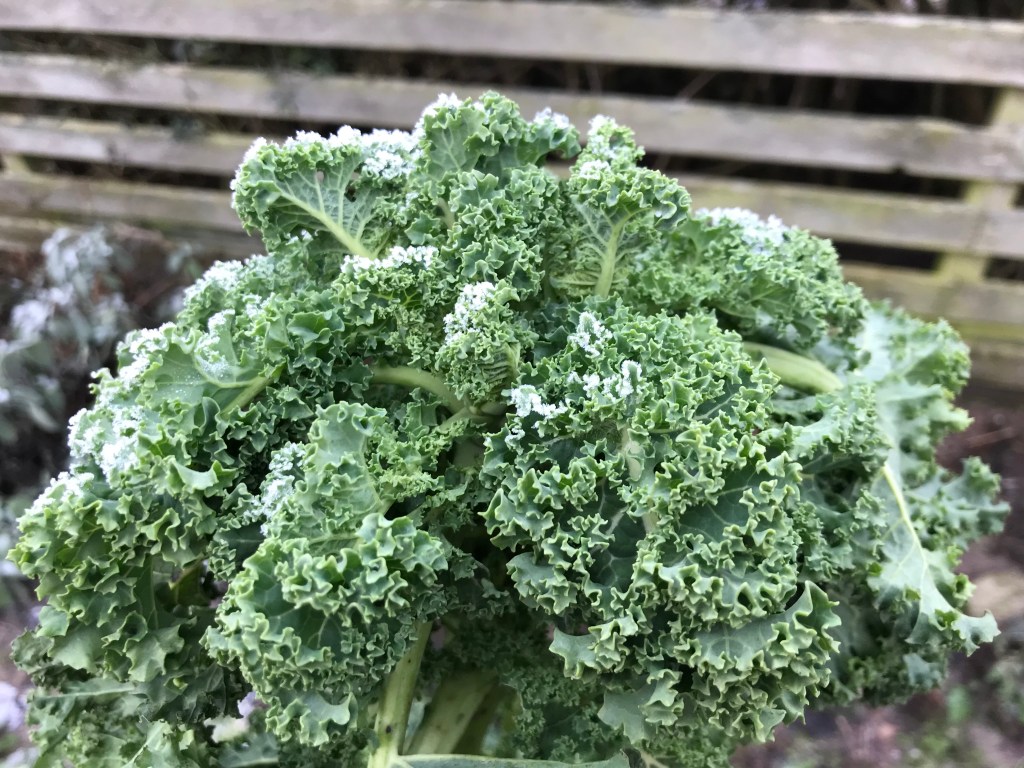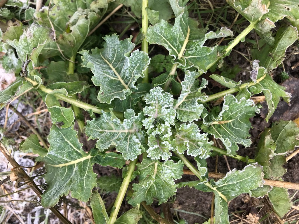 Grønkål, evighedskål og palmekål har set noget ynkelige ud, efter flere nætter med hård frost. Planterne er nu kommet ovenpå igen – kun få af de nederste blade er gået til. Vinterporrerne, isoleret med et tykt lag blade, har klaret sig fint.
