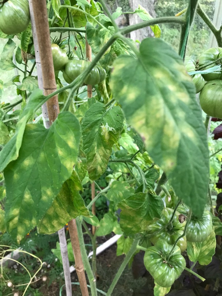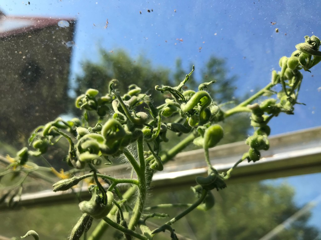 Som tidligere skrevet, bruger jeg hestegødning i drivhuset – det har fungeret fint igennem rigtig mange år. Lige indtil forrige år, hvor tomatplanterne pludselig begyndte at mistrives. Først blev bladene derforme og forkrøblede, og senere var der også tydelig misvækst i selve tomaterne, jf. billeder.