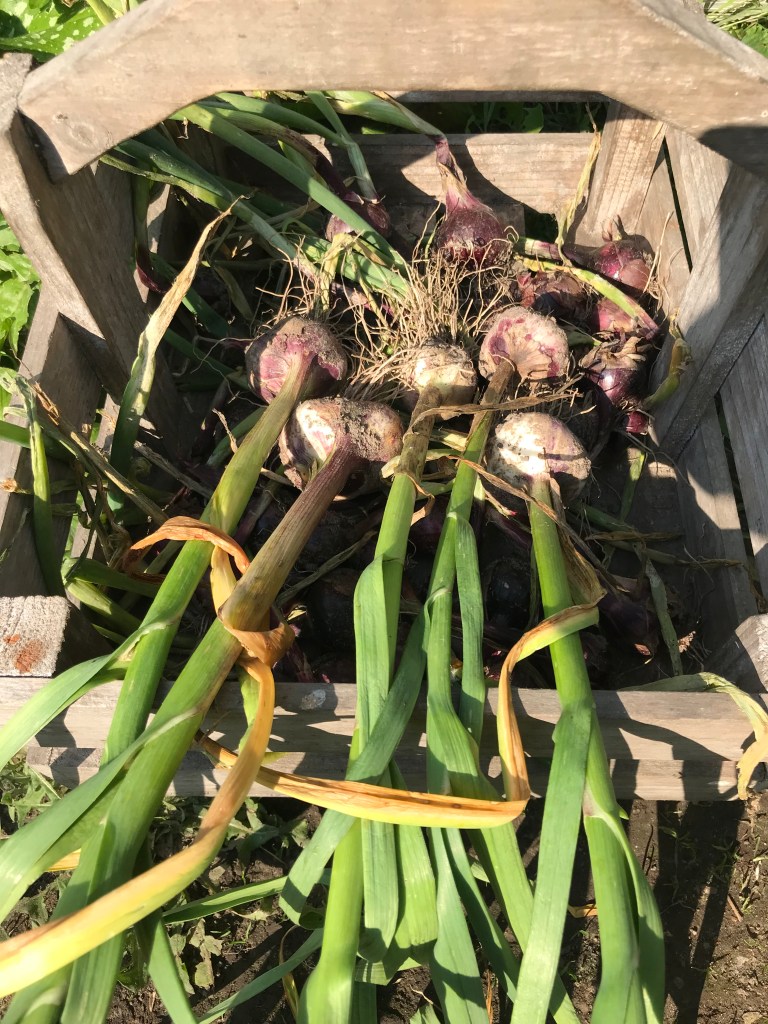 Jeg startede med at høste Flavia i begyndelsen af juni måned – en kartoffelsort jeg selv har holdt i live i flere år, da den ikke længere er til at opdrive. Jeg lader et par planter stå til næste års læggekartofler, tager de pæneste fra, og opbevarer dem i et frostfrit uderum.