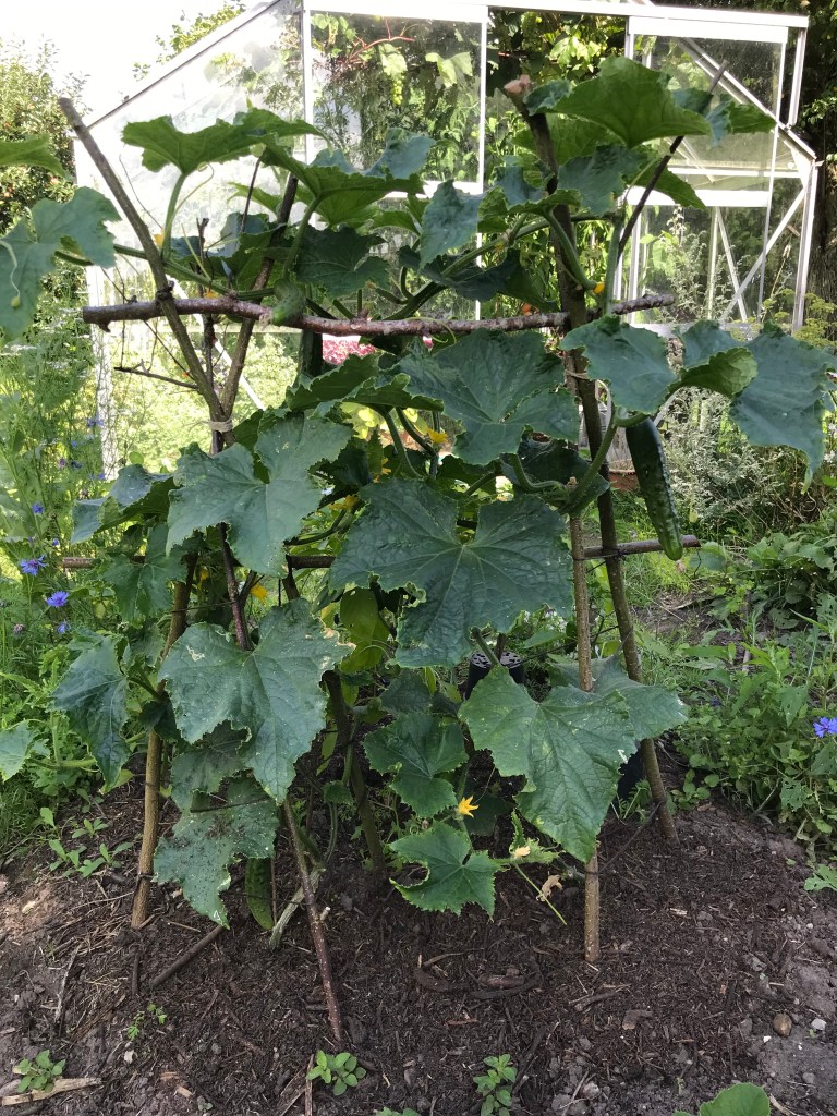 Her står 4 forskellige sorter, i en tipi bygget af 4 robuste hasselgrene – en bred snittebønne, den lilla Blauhilde, en voksbønne og en ukendt sort af haricots verts typen – 5-6 planter om hver stang.
