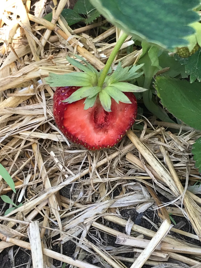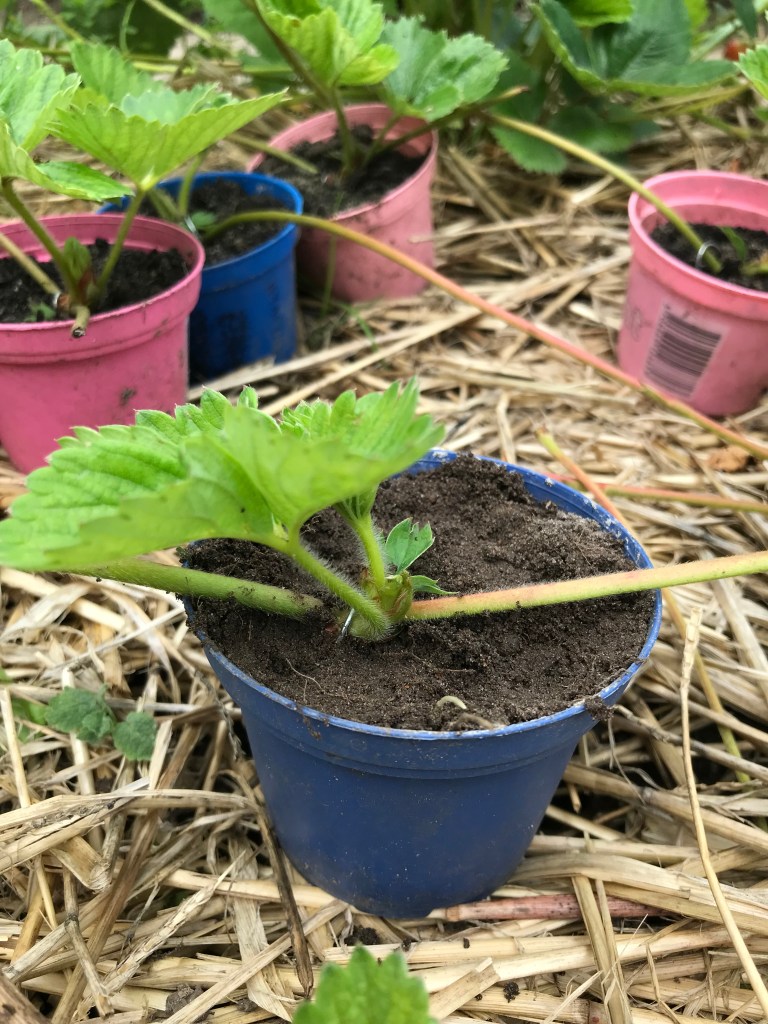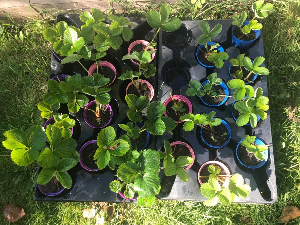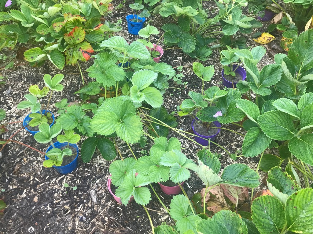 Udløberne fra jordbærplanerne har stået i potter under rodsætningen – forskellige farver, alt efter sort – se evt. juli 2023. De er nu videre i det nye jordbærbed, hvor der først på sæsonen har stået sommerkål.