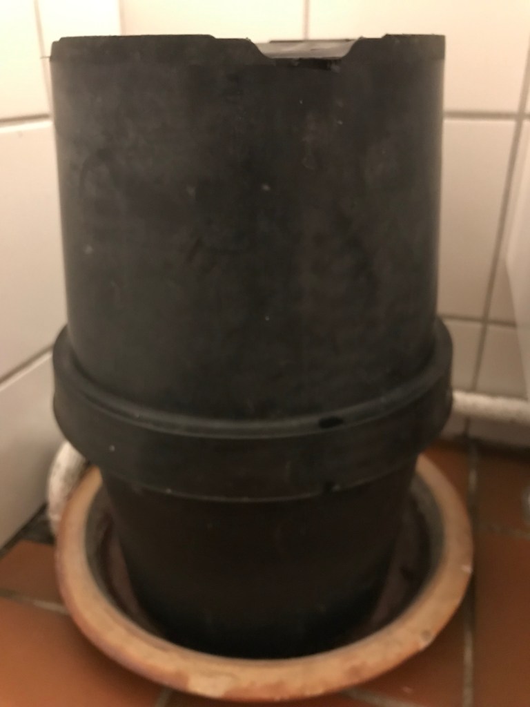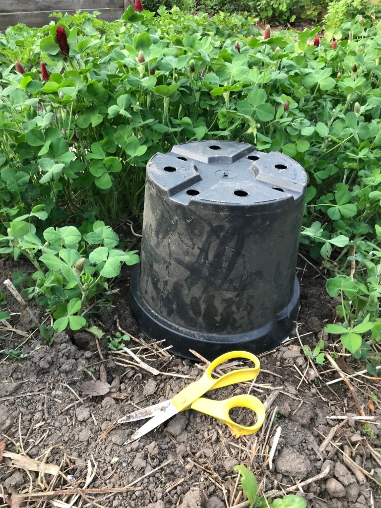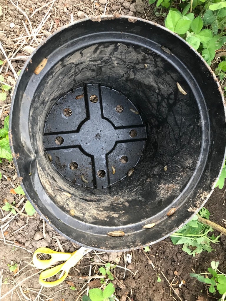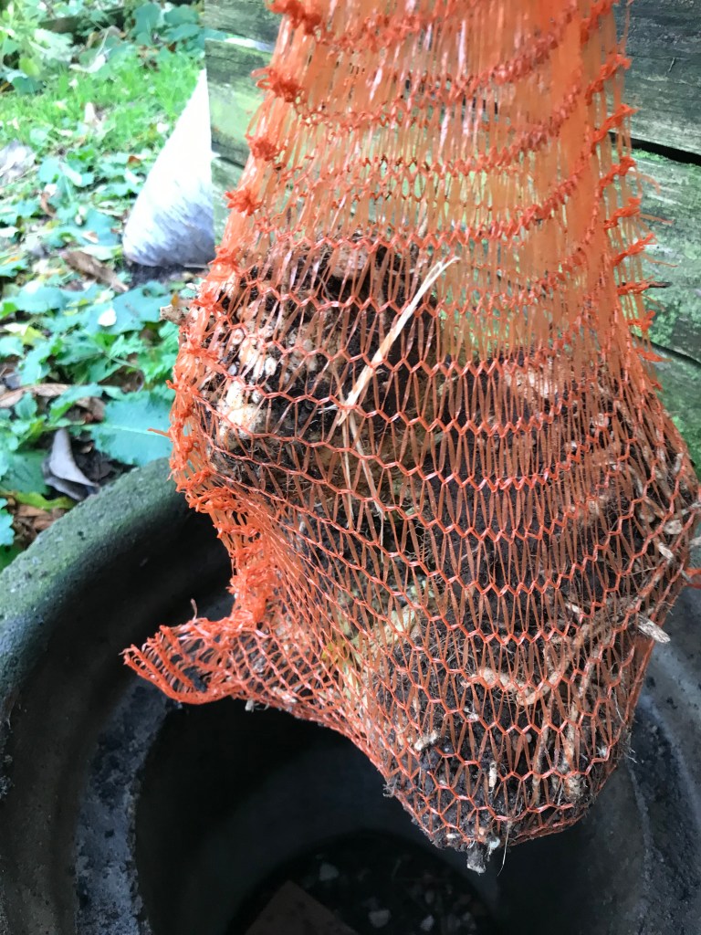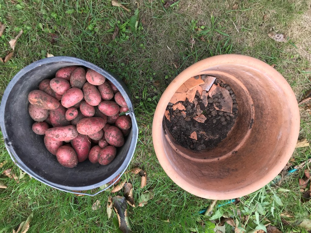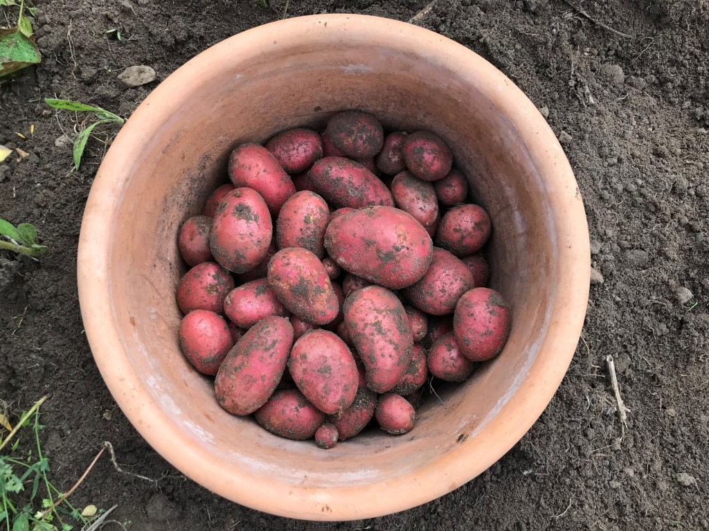 I år har jeg sikret høsten mod høns, mus og mosegrise, ved at lægge kartoflerne ned i store krukker med lidt dræn i bunden (potteskår), og dække dem med jord. Krukkerne er gravet ned i jorden og endelig dækket af med en omvendt urtepotte, for at skåne for regn. Kartoflerne er nu lette at fiske op, og holder sig forhåbentlig væsentligt bedre end i en kasse i udhuset, indtil kulden sætter ind.