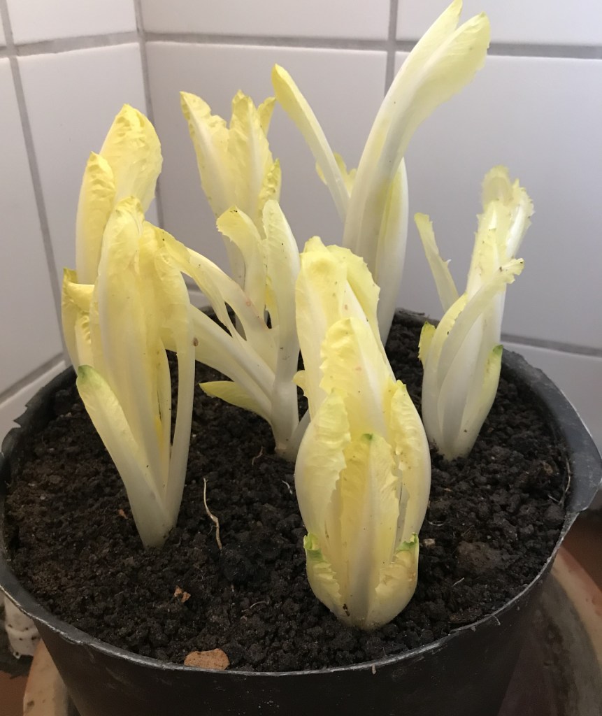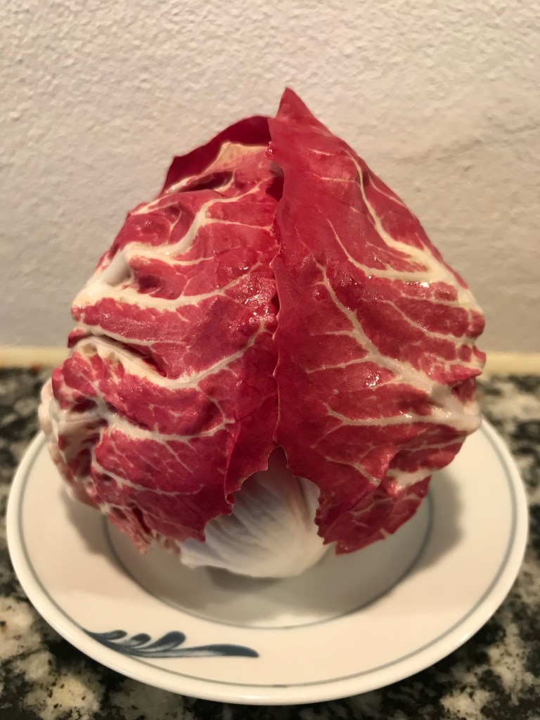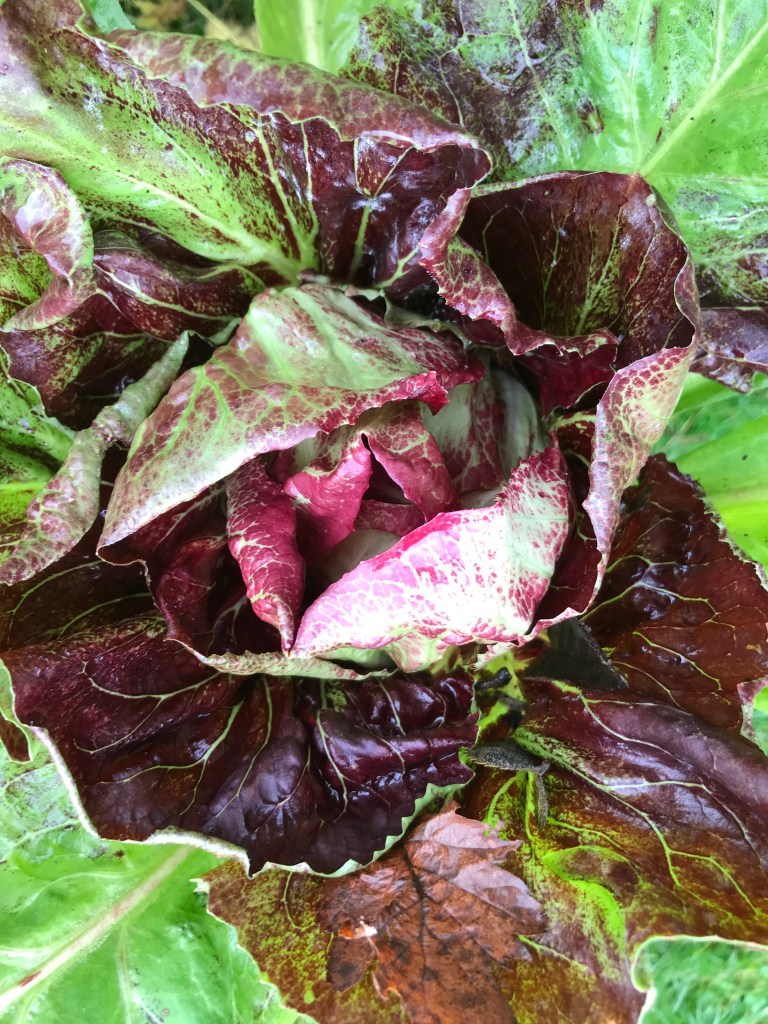 Står stadigvæk sprød og lækker, efter flere nætter med frost. Det er et dejligt supplement til vinterkålen i salatskålen – flot at se på med de spraglede rød-hvide blade, samtidig med en rigtig god, let bitter smag.