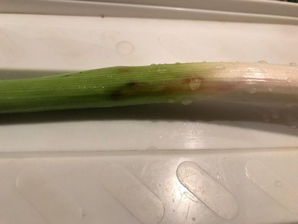 Der findes andre skadedyr der holder af porrer, fx ageruglens larve – knopormen. På nuværende tidspunkt, en blegfed, lillefingertyk skabning med en voldsom appetit, jf. foto.