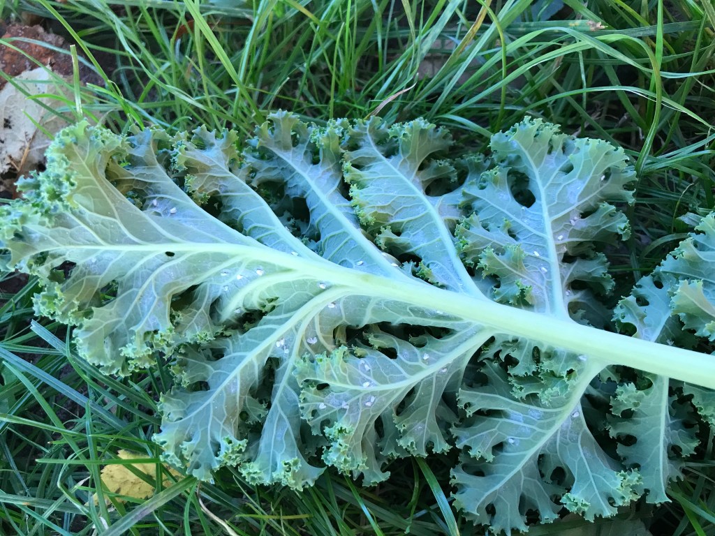 Jeg vil fortsætte hvor jeg slap i september, med skadedyrene, hvor jeg ikke fik nævnt den irriterende hvide kålflue, eller måske mere korrekt mellusen. Der har været et massivt angreb af dem i min tidligt såede grønkål. Billederne er fra den samme plante, med blade fra hhv. bunden og toppen, der stadigvæk er brugbar. Planterne der blev sået i slutningen af maj, står stort set urørt.