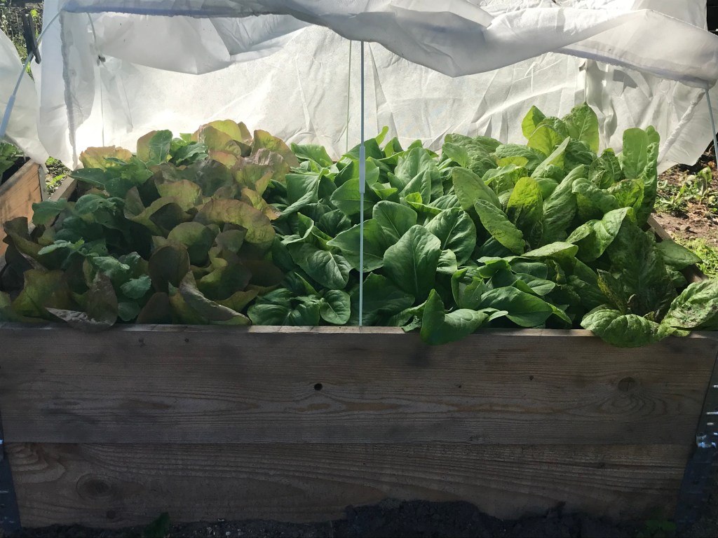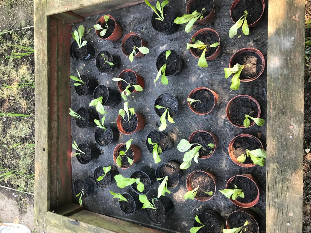 Enkeltvis plantning i potter gør vandingen nem, og samtidig er det mere overskueligt at opdage og fjerne fx agersnegle. Planterne i salatbaren er overdækket med fiberdug.