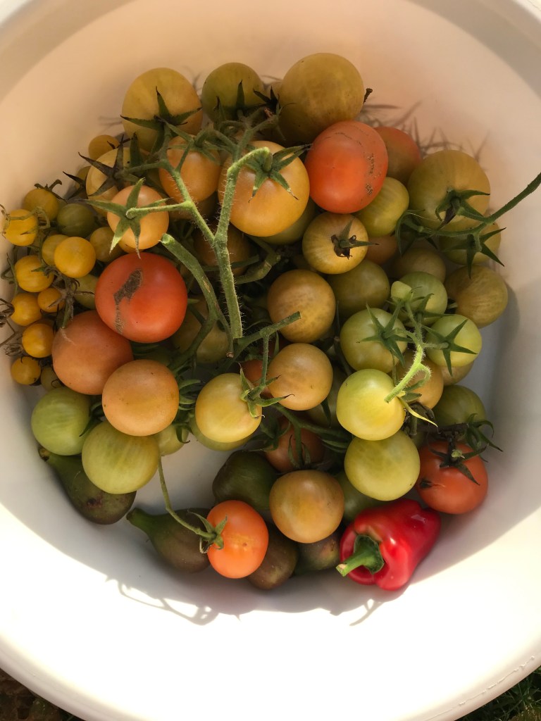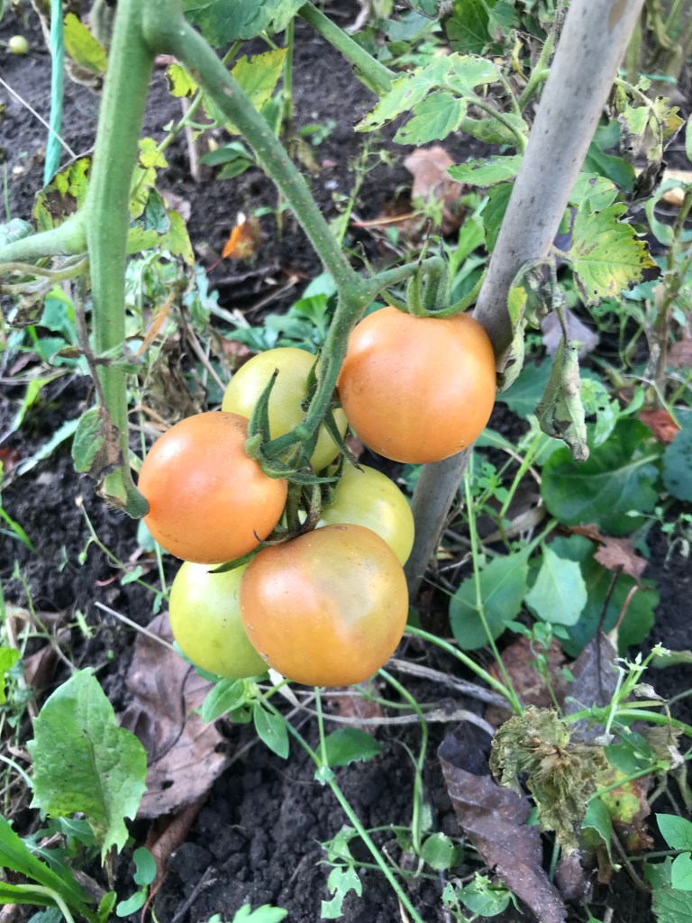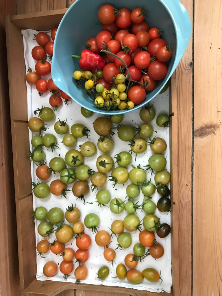 Det er kun to uger siden de sidste frilandstomater blev høstet. Mountain Magic og den lille gule ribstomat Golden Currant havde fint klaret en enkelt nat med let frost, beskyttet af fiberdug.