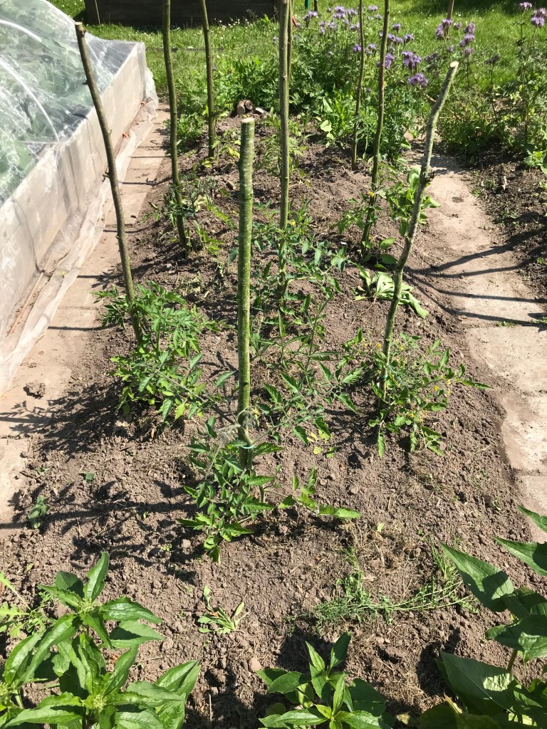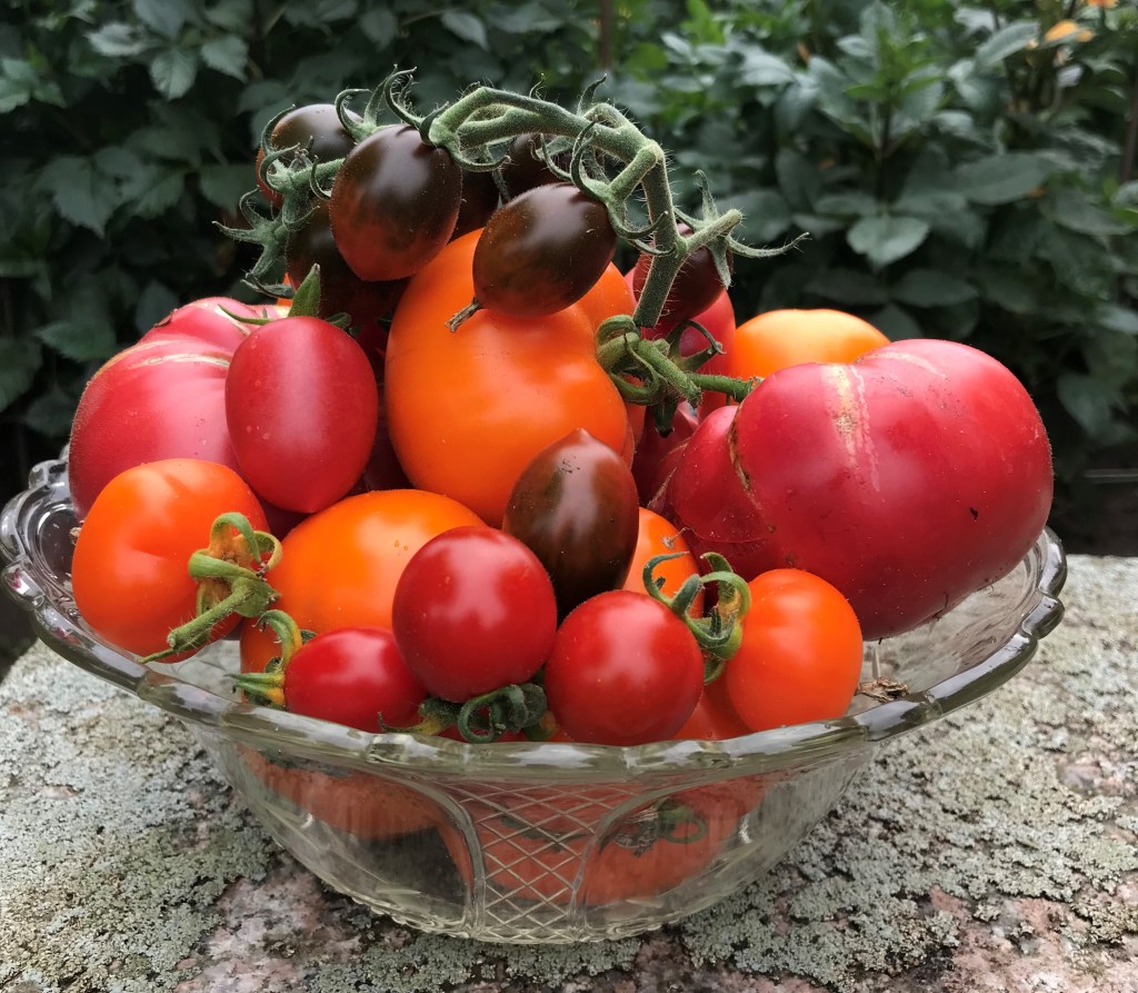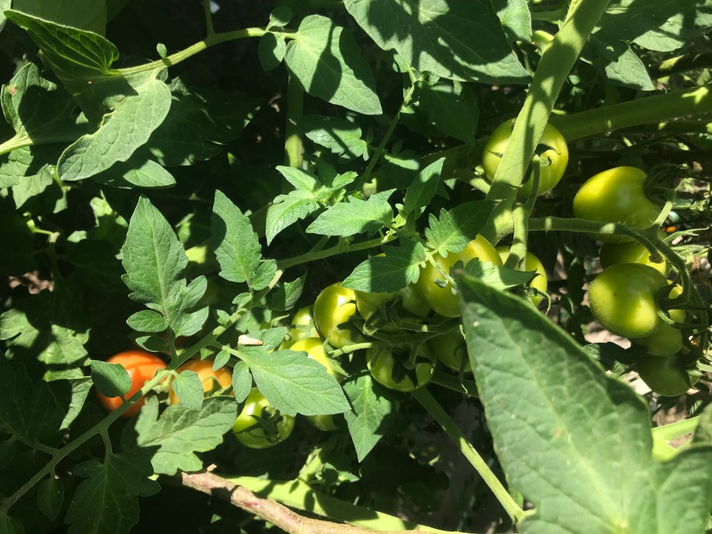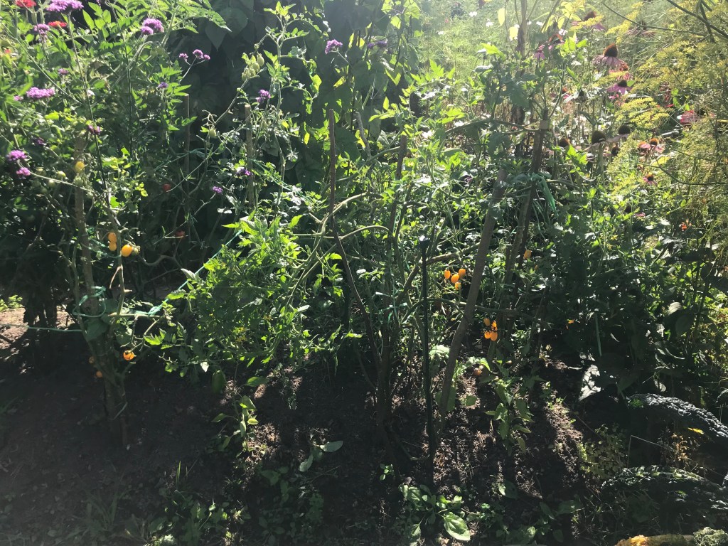 På trods af store udfordringer med nedbør og blæst, stod tomaterne rigtig fint – lige indtil slutningen af juli, hvor de fik skimmel. I starten kunne jeg holde angrebet nede ved at afklippe de syge blade, men 5 dages fravær, satte for alvor gang i ulykken. Der blev tyndet gevaldigt ud i de syge planter, der nu står med friske blade, og få, brugbare tomater. Tre af de 10 planter, bl.a. Mountain Magic der er klassificeret som skimmel-resistent, står stadigvæk upåvirkede, med mange gode tomater.