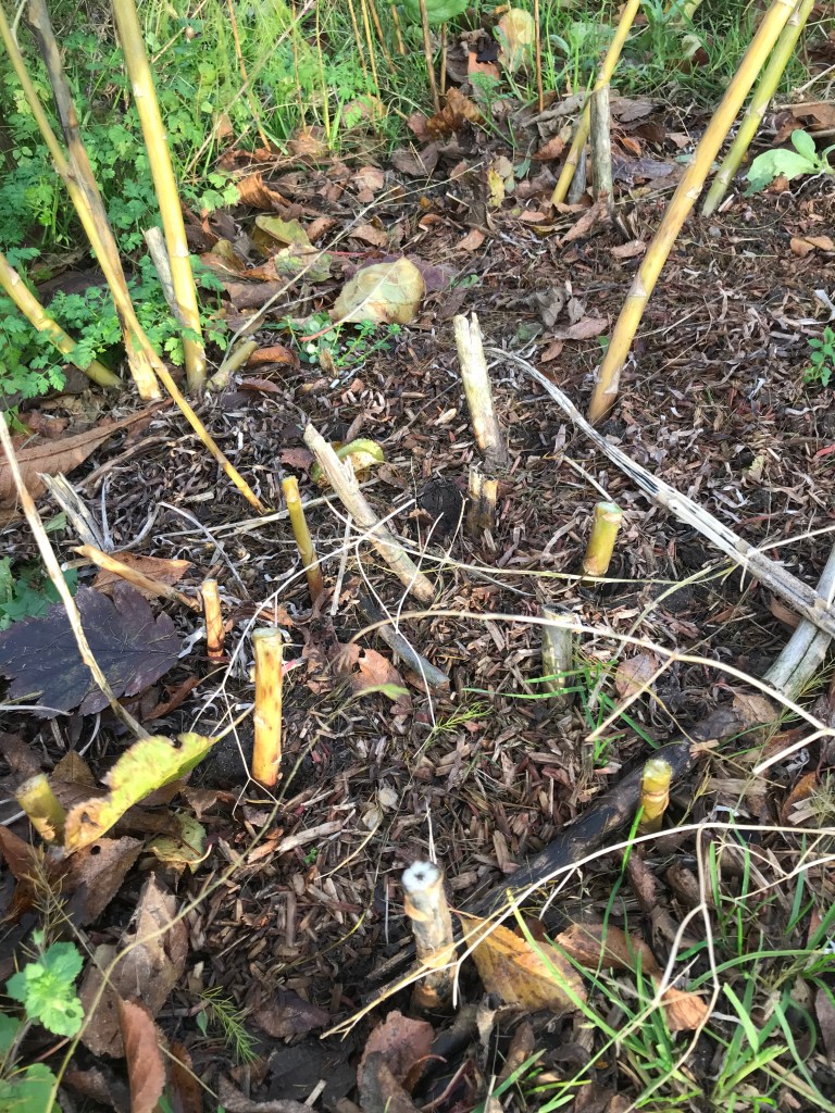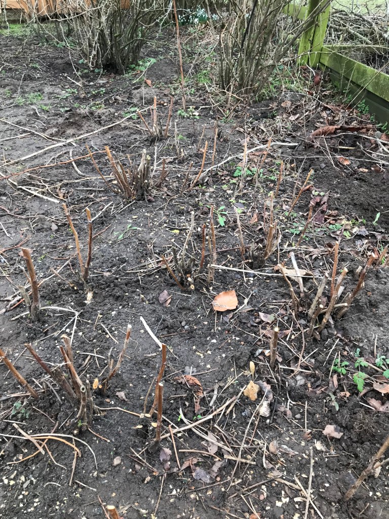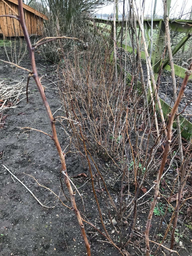 Efterårshindbærrene er skåret ned, hvilket skal gøres i februar, eller allersenest i marts, hvor næringsstoffer fra blade og skud er trukket ned i jorden og oplagret i rødderne.