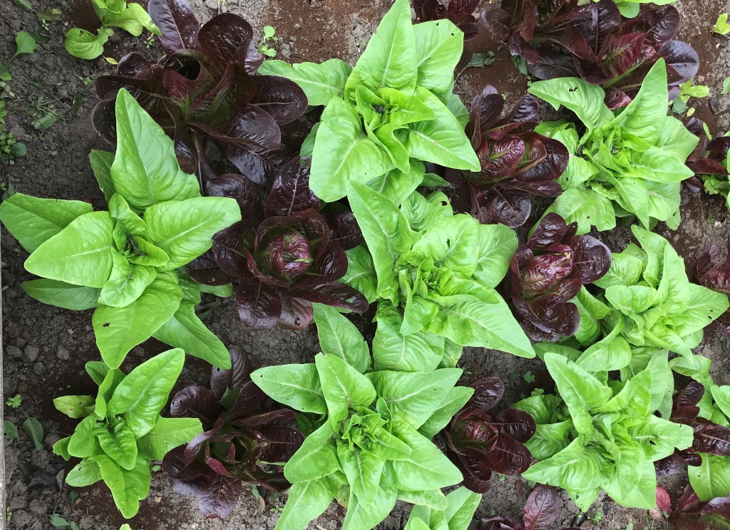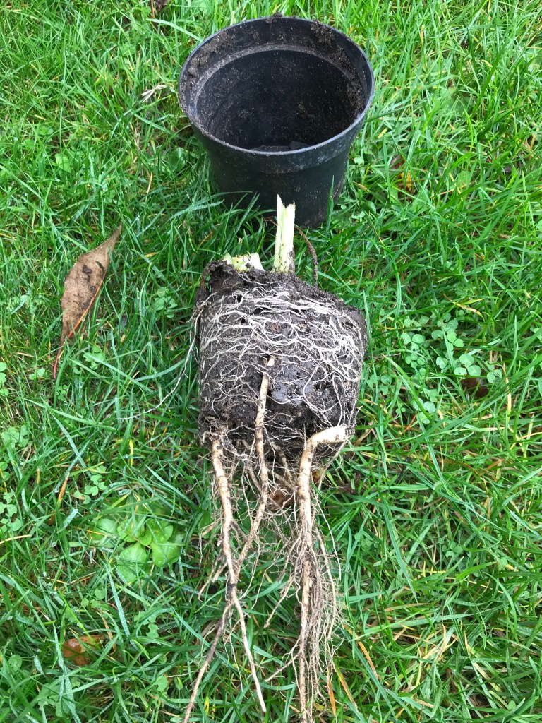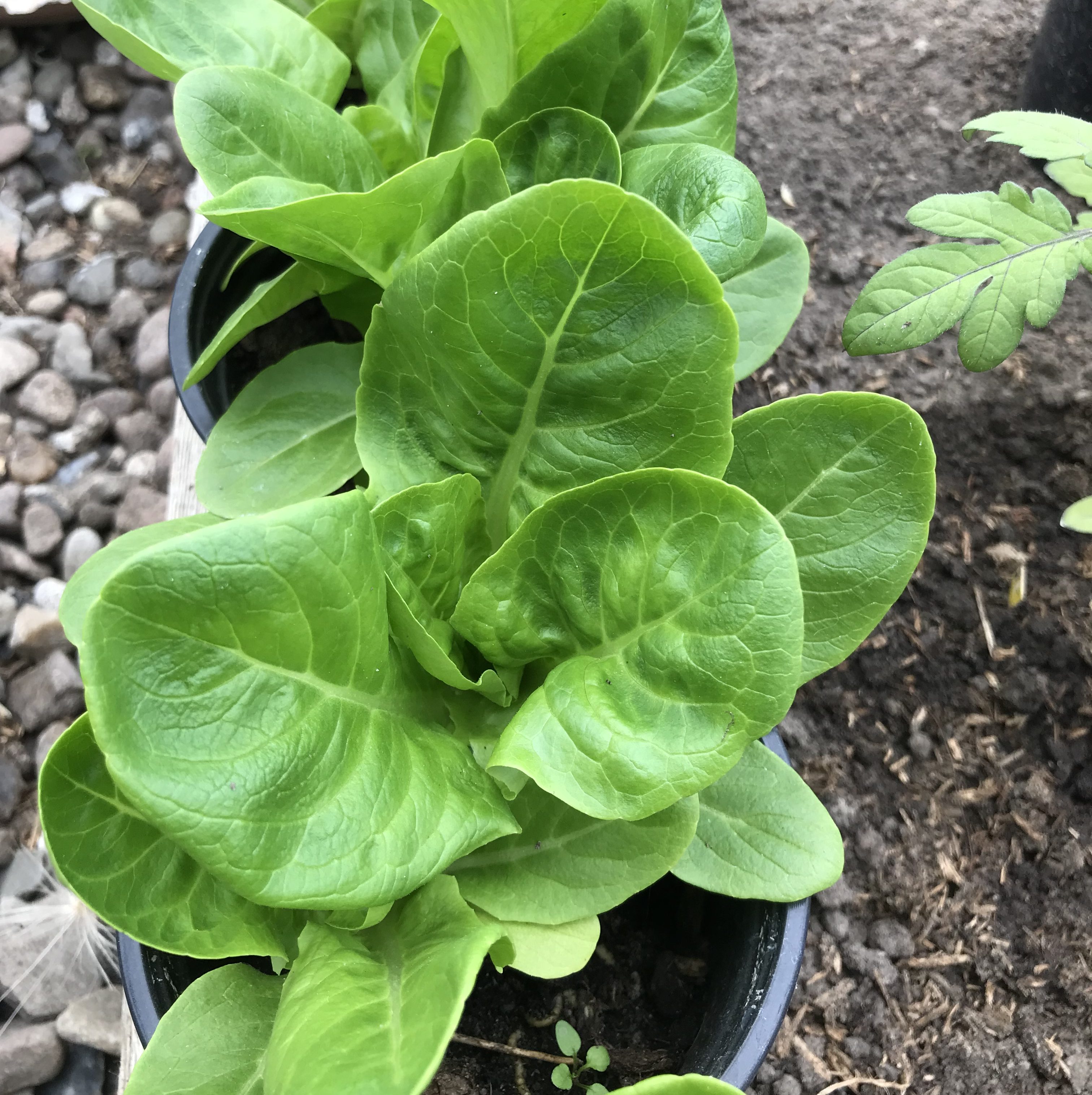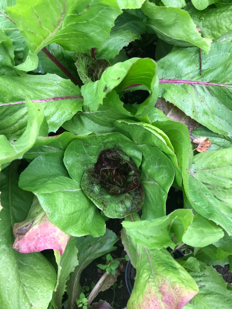 Det første hoved er høstet, af denne smukke italienske salattype, der ender som et lille fast hoved, omsluttet af blanke, rødmelerede blade. Småplanterne blev udplantet i 10-12 cm urtepotter ¾ fyldt med jord, der blev stillet oven på jorden i en passende afstand. Der var flere fordele ved potteplantningen; det var nemt at gennemvande planterne direkte til rødderne og de var delvis beskyttet mod evt. skadedyr, der var nemme at spotte på den bare jord mellem potterne. Som det ses på billedet, har planterne etableret et kraftigt rodnet, med dybe rødder igennem huller i potterne, og de står i dag som store, robuste og sunde planter.