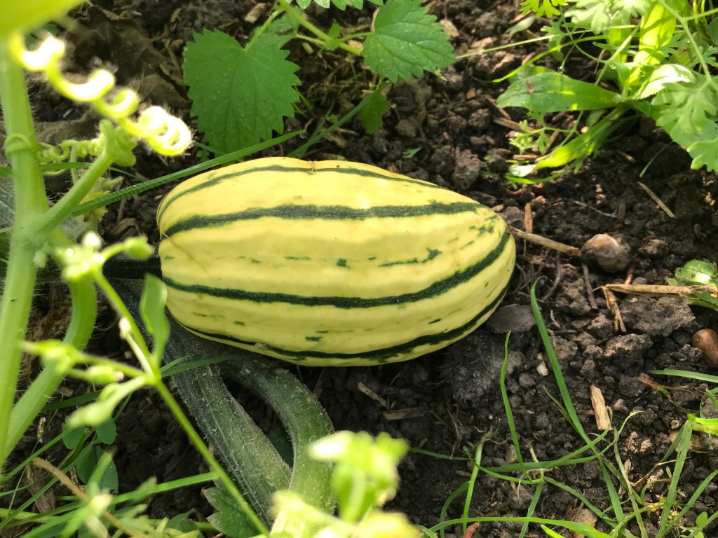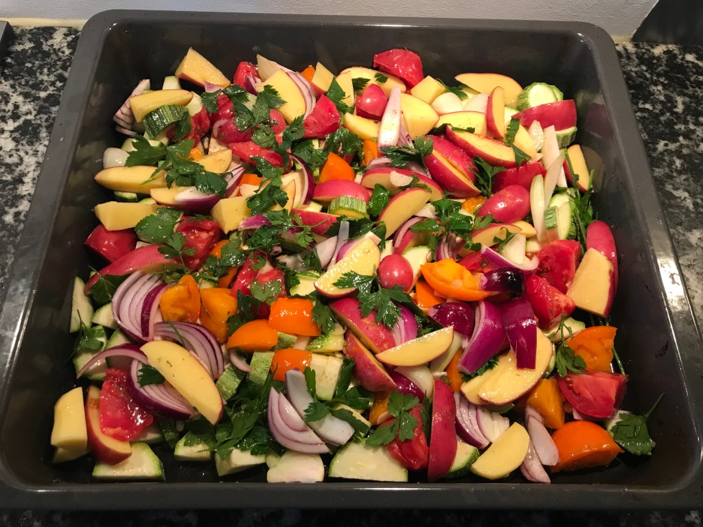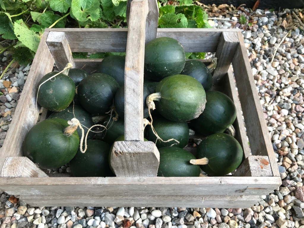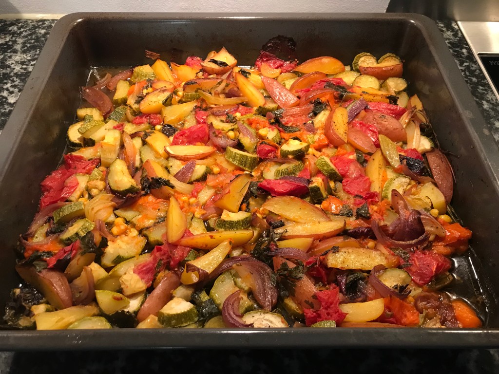 På trods af tørken, har der alligevel været en masse god mad at hente i haven, fx squash og tomater, der elsker varmen. Det er bl.a. blevet til en gang Briam, den græske, ovnbagte udgave af Rataouille – skønt!