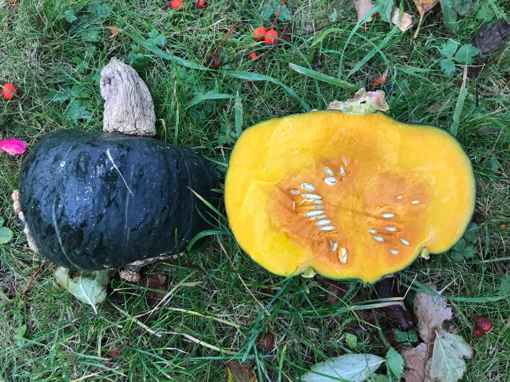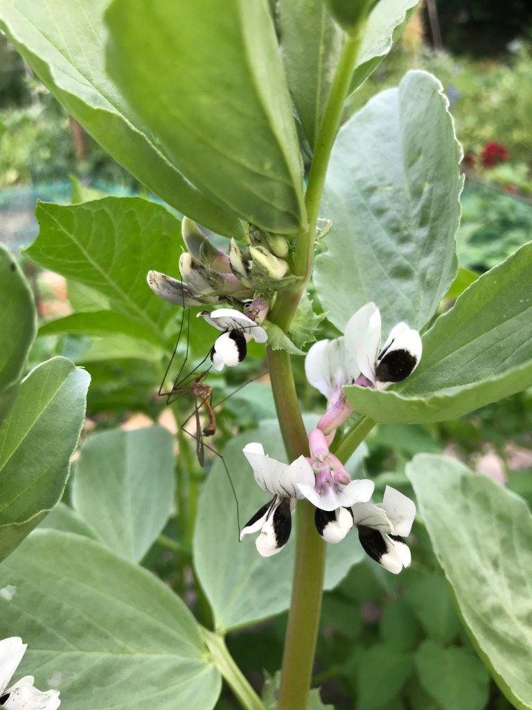Græskar udnytter nu pladsen i kartoffelbedet Høsten af hestebønner er startet. Det er en dejlig, lidt overset afgrøde, der vokser i midten af bedet mellem de sene kartofler, der kræver god plads. Herved udnyttes bedet optimalt, der samles kvælstof til næste års afgrøder, og de flotte blomster giver god mad til de flyvende insekter, som den langbenede skønhed der sidder midt i billedet.