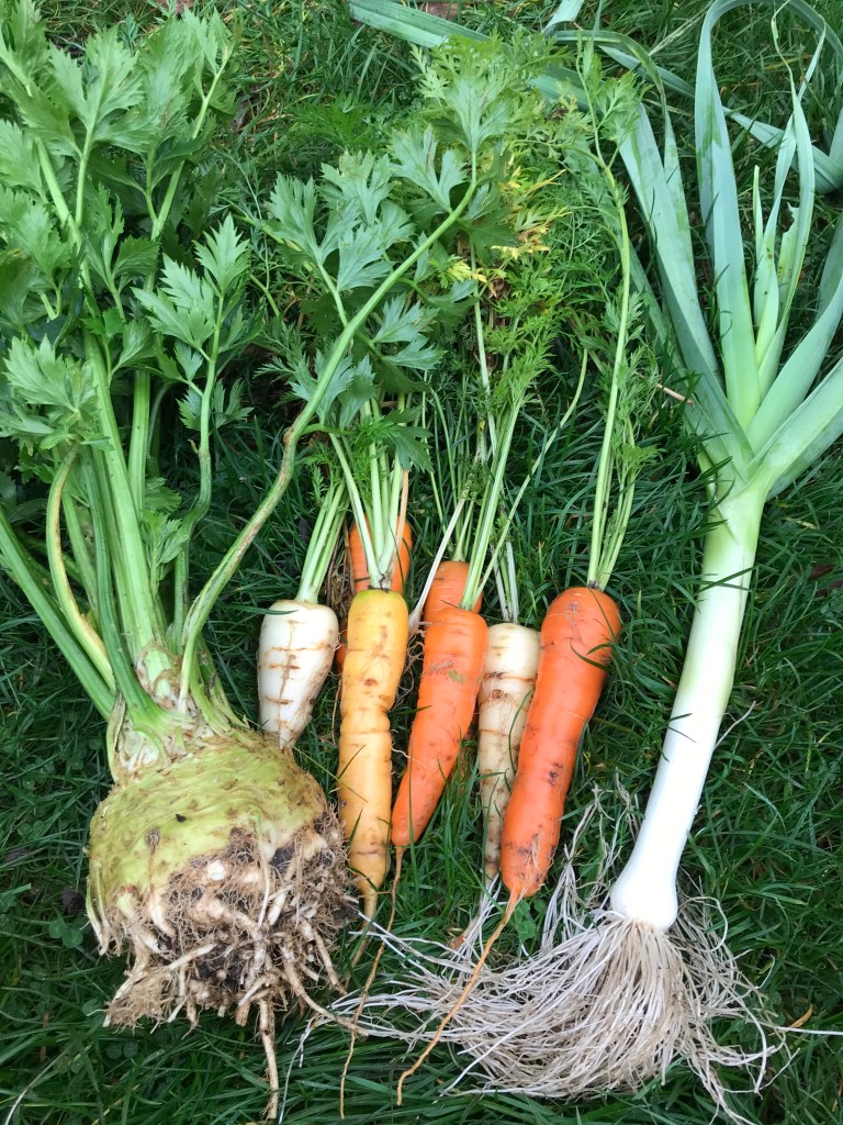 Her er der taget grønt fra til suppekøkkenet, men der er en synlig mangel – pastinakken! En af de afgrøder hvor spiringen gang på gang slår fejl i min køkkenhave. Jeg gør et nyt forsøg igen til næste år.