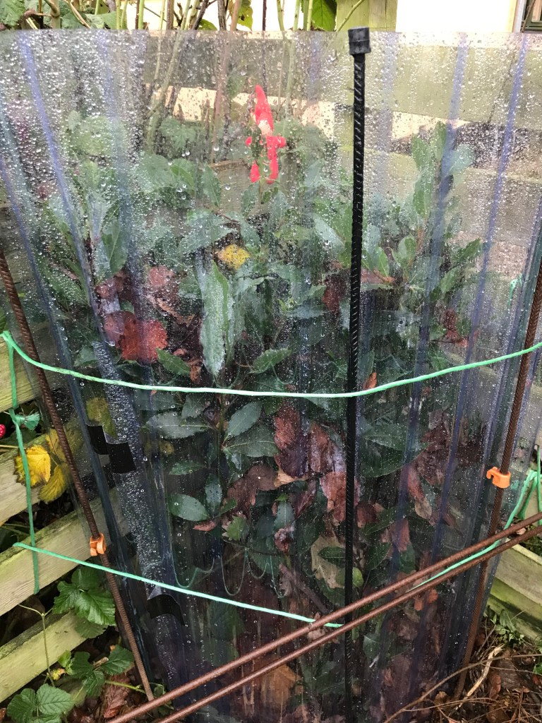 Er ikke fuld vinterhårdfør i Danmark, men kan overleve ned til -10°C, hvis den dækkes til. Vinterdækningen skal dels beskytte de nye skud mod den udtørrende barfrost og skarpe forårssol, og dels forhindre solen i at varme bladene op, mens rødderne er frosne. Jeg har i år forsøgt mig med en klar plast trapezplade rundt om busken, suppleret med visne blade mellem grenene – måske skal der også et “solgardin” op, når foråret nærmer sig….